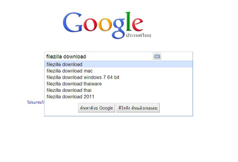 1. เข้าเว็บไซต์ google.co.th แล้วค้นหาด้วยคำว่า "filezilla download" ตามตัวอย่างเพื่อหาเว็บไซต์ที่ให้บริการดาวน์โหลดโปรแกรม FileZilla